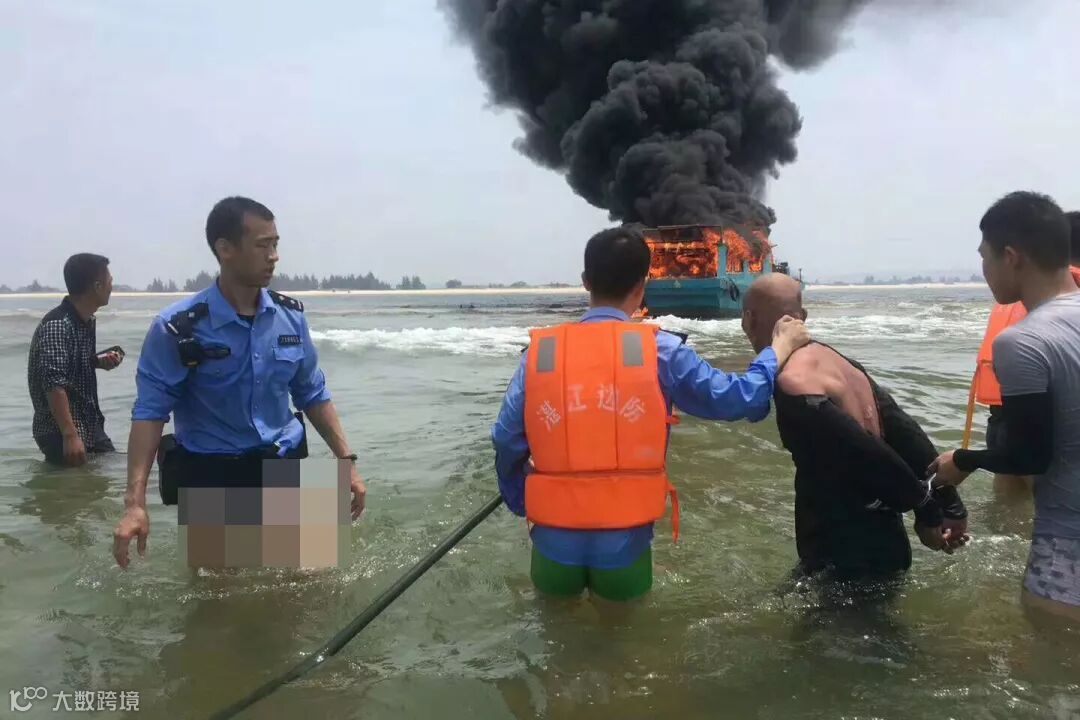 从湛江市公安局边防支队获悉,昨日(4月10日),该支队企水边防派出所民警在抓捕抢劫渔船的嫌疑人韦某时遭暴力抗法,韦某点燃液化气和柴油,渔船燃起大火,民警将其救出。民警和嫌疑人刚离开渔船,渔船便发生爆炸。