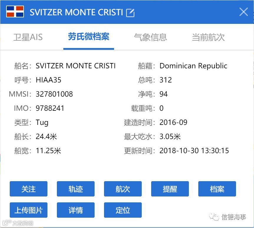 这艘拖轮的船名为Svitzer Monte Cristi,是一艘有70吨系桩拉力的在圣多明戈港为船舶提供港口拖航服务的港拖。