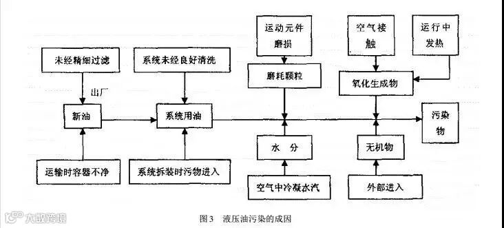 船上大多数的液压设备都处于露天甲板上,经常经受风吹、日晒、雨淋以及海洋气候、自然条件的影响,一旦出现故障势必影响船舶的正常生产及安全。避免与减少液压油的污染是减少液压设备故障的关键。据统计70% 一80% 的船舶液压设备故障与液压油的污染有关,液压油污染是液压设备发生故障的主要原因。下图为液压油污染的成因。