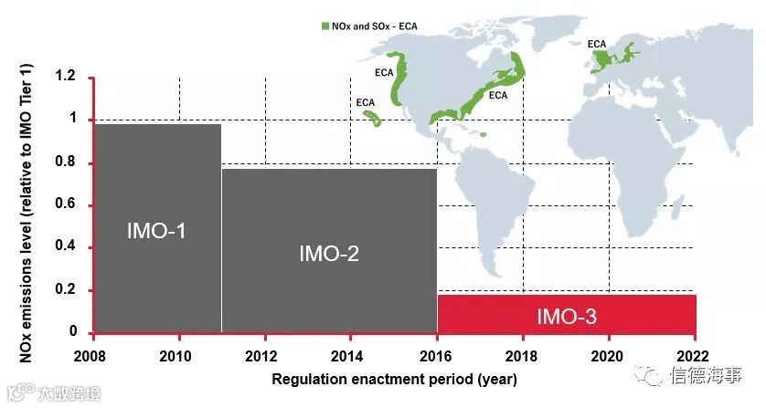 信德海事网观察到,除硫氧化物外,波罗的海和北海排放控制区实施的排放控制还将扩充至涵盖氮氧化物。2021年1月1日或之后建造的船舶上所安装的输出功率在130千瓦以上的发动机如果要在此等两个区域内运行,必须通过Tier III排放标准认证。这一规定同样适用于现有船舶于2021年1月1日或之后安装的与原发动机不同的替换发动机或额外发动机。自2019年1月1日起,全部四个排放控制区(波罗的海、北海、北美和美国加勒比海)实施的排放控制将同时涵盖硫氧化物和氮氧化物。