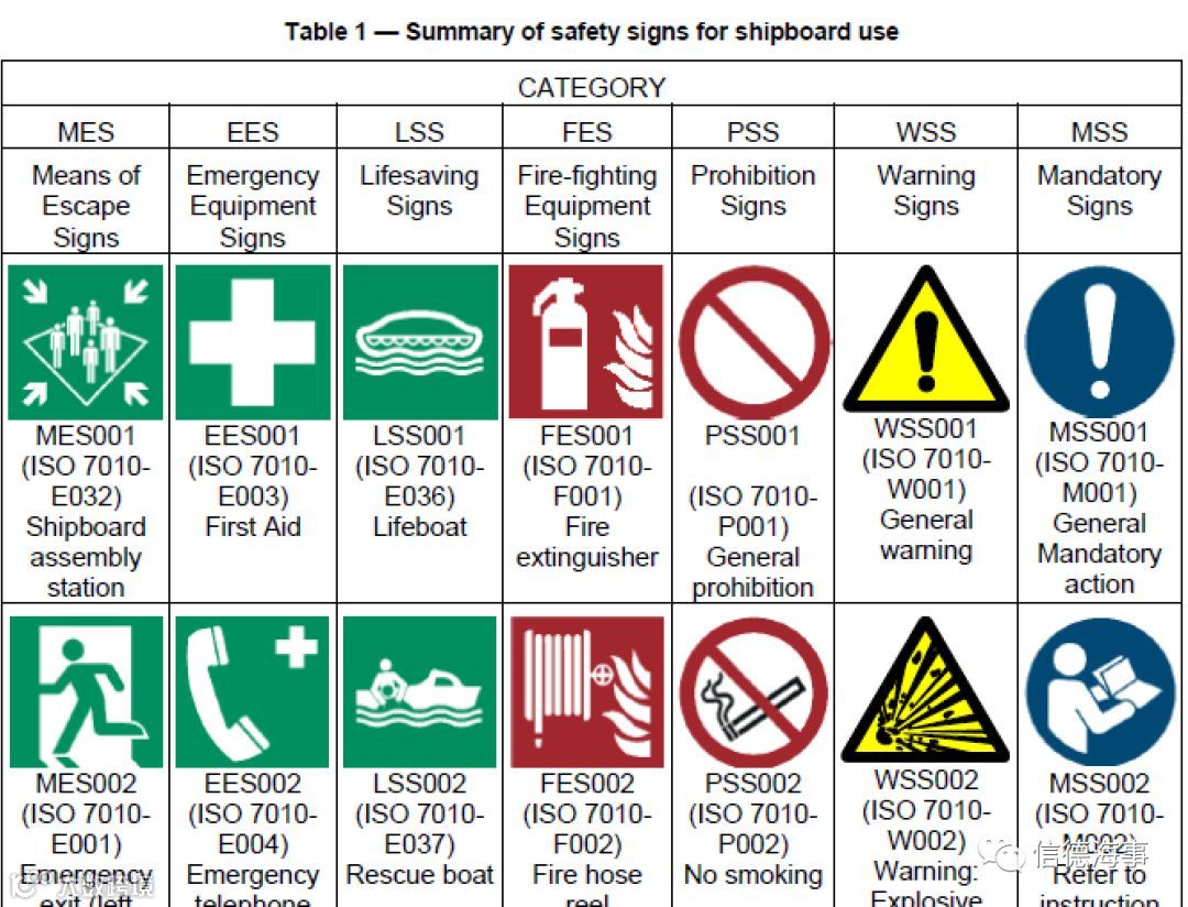 为了确保安全标志与ISO(国际标准化组织)标准保持一致,国际海事组织更新了用以标示脱险通道位置、救生系统以及投放救生设备的强制行动标识的标志和图形符号。安全标志与设备位置标识现已与ISO标准保持一致。所有于2019年1月1日或之后建造的以及于2019年1月1日或之后进行《国际海上人命安全公约》第II-2章和/或第III章(如适用)所载范围内修理、改装、改建和舾装的船舶应确保船上标志与国际海事组织第A.1116(30)号决议附录中表1、2和3中的符号保持一致。该决议还规定,在绘制《国际海上人命安全公约》第II-2章第15.2.4条所要求的防火控制图时,此等标志应结合第A.952(23)号决议共同使用。