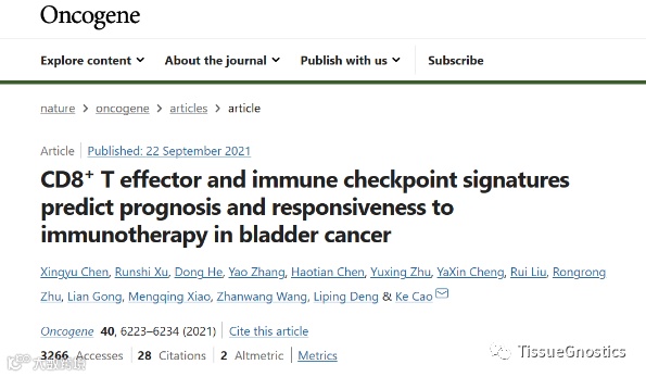 中南大学湘雅三医院的曹科团队在Oncogene上发表了题为 “CD8+ T effector and immune checkpoint signatures predict prognosis and responsiveness to immunotherapy in bladder cancer” 的研究论文。