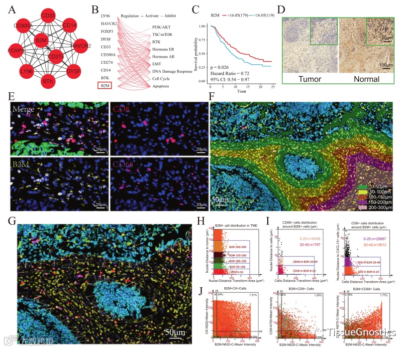 生存分析表明,B2M和CD274高表达的患者生存期较长而CD300A高表达的患者生存期较短。在此基础上,我们进一步探讨了B2M与膀胱癌免疫浸润的相关性。首先,免疫组化图像分析(图1D)显示B2M在肿瘤组织中的表达高于正常组织。文章使用多色免疫荧光染色方法来探索B2M与肿瘤微环境的相关性(图1E-H)。通过对肿瘤组织周围不同距离梯度的B2M+细胞进行量化,我们发现B2M+细胞的数量随着距离肿瘤细胞的距离而逐渐减少(图1F,H)。B2M+细胞40μm内CD8+T细胞和CD68+巨噬细胞的定量分析使用TissueGnostics公司专业StrataQuest定量分析软件。