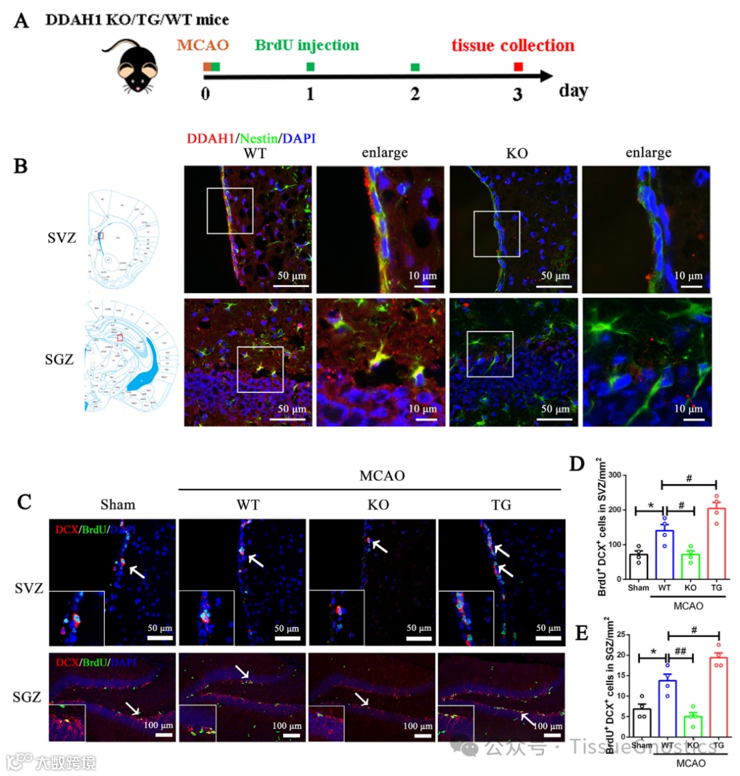 (B)同侧SVZ和SGZ中DDAH1和Nestin免疫荧光染色的代表性图像。