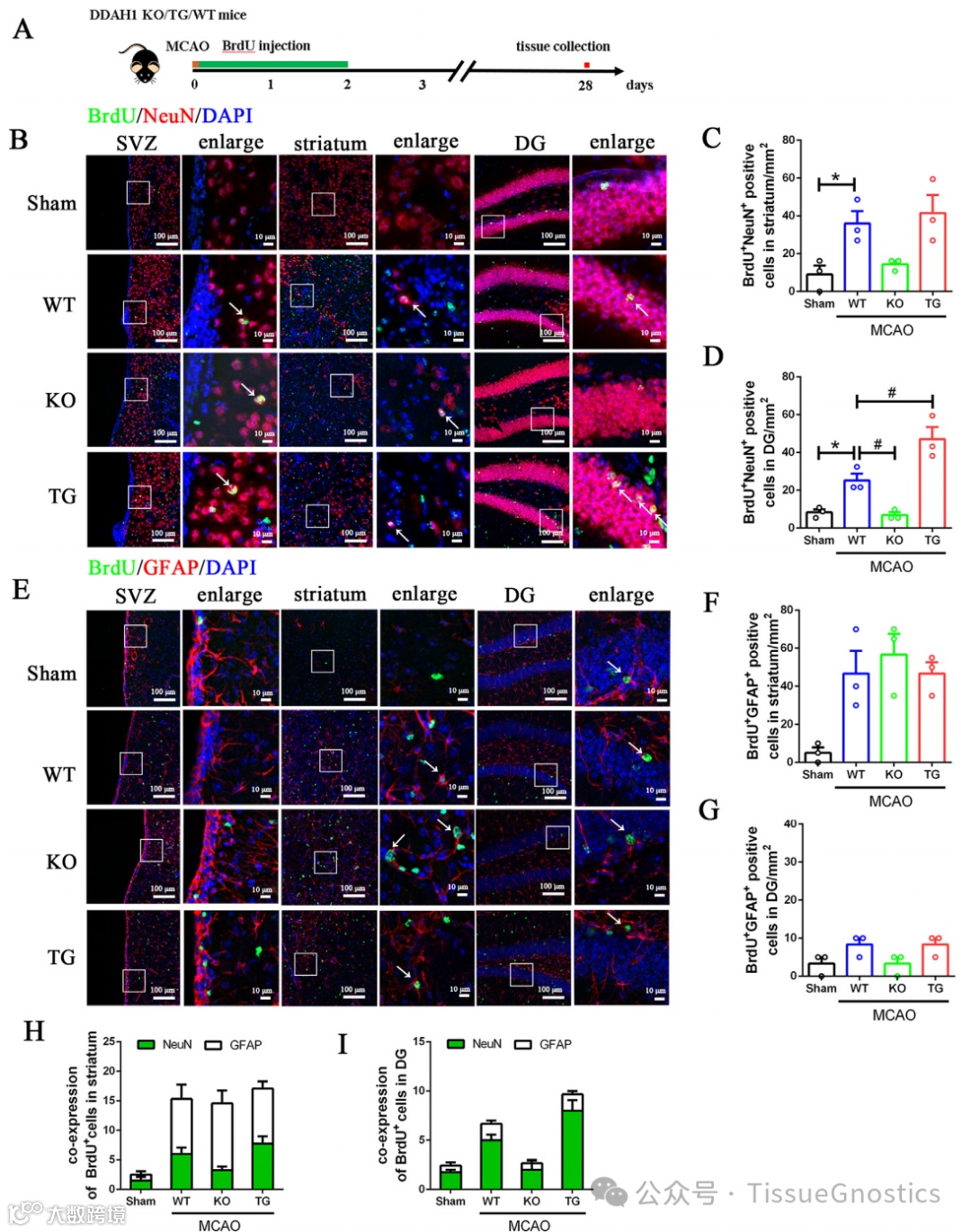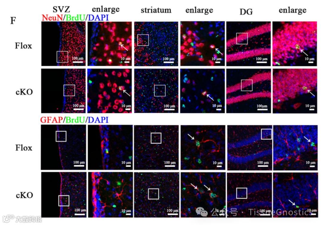 (H, I)纹状体和DG中BrdU、NeuN和GFAP的表达情况。