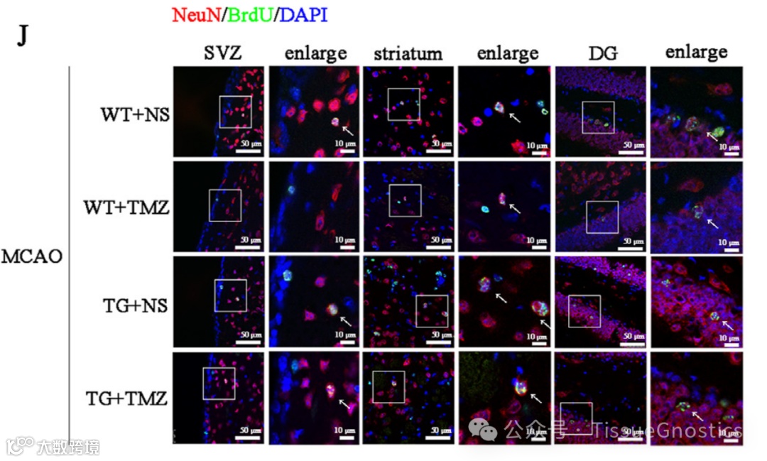 (J)同侧SVZ、纹状体和DG BrdU和Neu免疫荧光染色的代表性图像。
