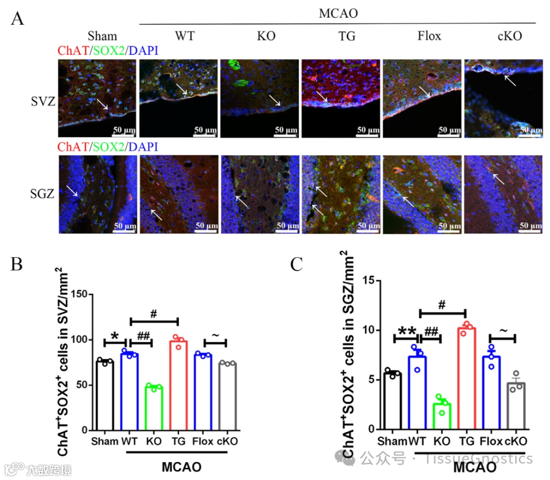 (A) SVZ和SGZ中ChAT和SOX2免疫荧光染色的代表性图像。(B) (B, C) SVZ和SGZ中ChAT、SOX2细胞的统计分析(每组n=3)。