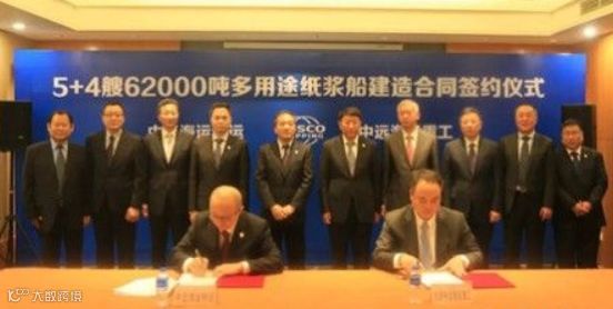 仪式上,中远海运特运董事会秘书董宇航、大连中远海运重工总经理高永强,分别代表双方在5+4艘62000吨多用途纸浆船建造合同上签字。