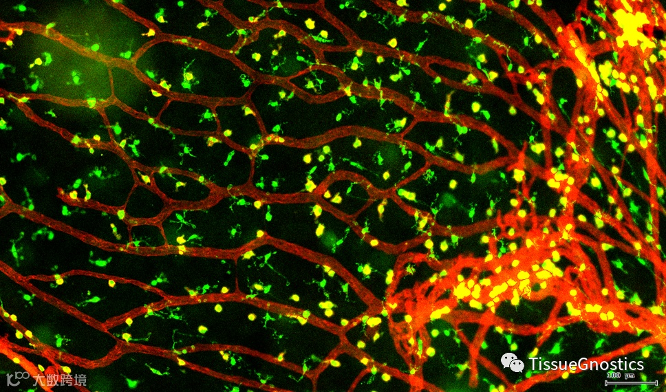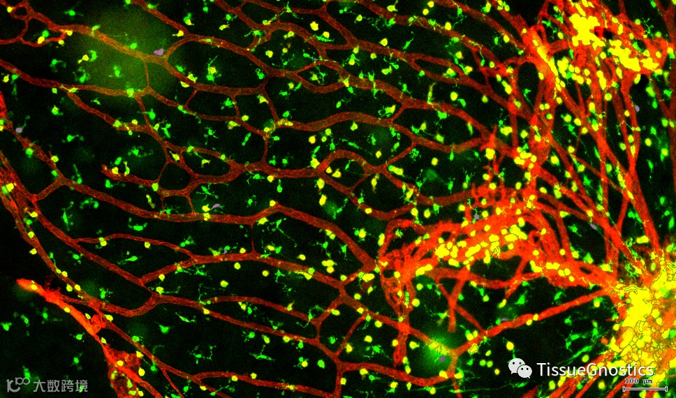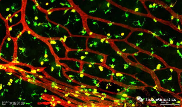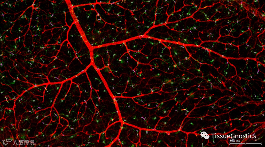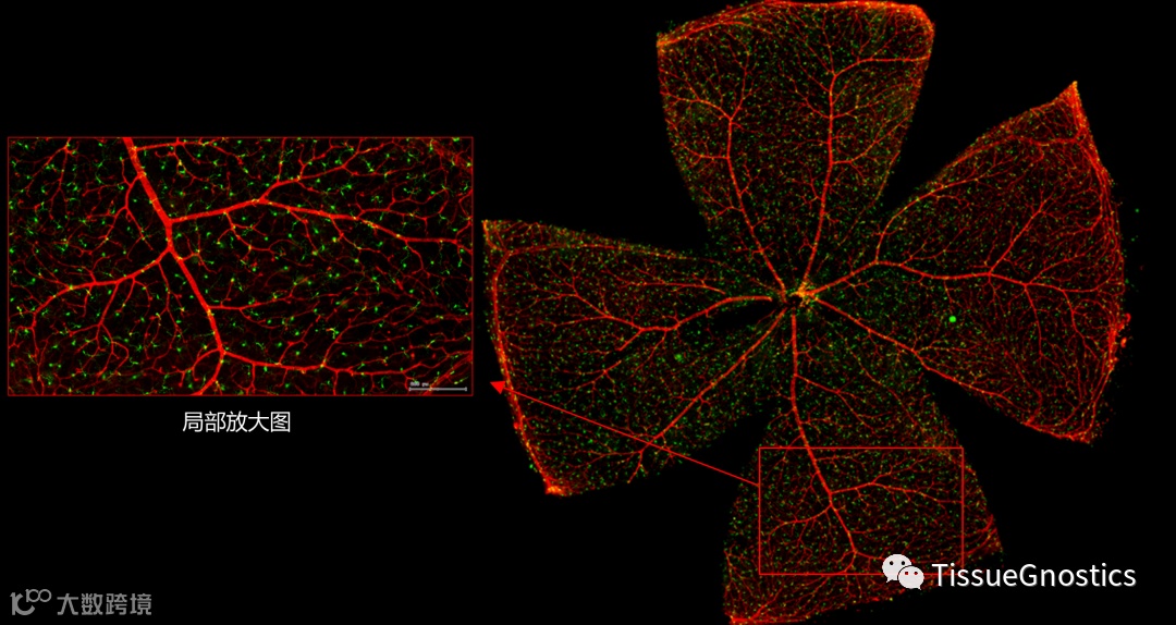 一般而言,眼底图像通常都是通过激光扫描成像进行采集,但是由于眼底可观测的视野往往是很有限的,一个患者的眼底信息需要多张扫描图像才能完全显示出来。这种局限性大大不利于病情进行全面的、细致的诊断。Tissue Cytometry全景组织流式定量分析技术进行全景图像获取,在单细胞、组织结构、细胞空间信息等多个层面进行定位、定性、定量分析。从而更好的对病变区域进行有针对性的跟踪观察和全面分析。
