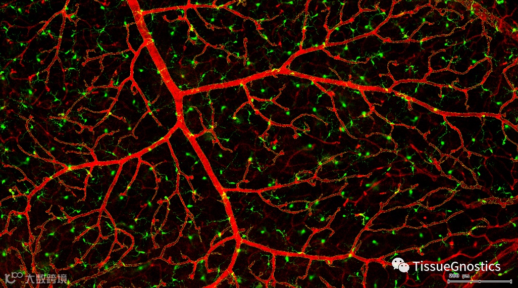 血管识别:根据Texa Red通道进行识别,并去除面积小的及非同一焦面的血管,仅对确定的清晰的同一焦面的大血管进行面积统计。