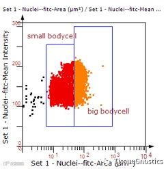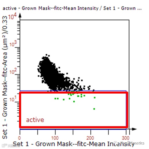 根据染色强度,染色面积,细胞形态学,利用正反向回溯功能和设门圈选Gating,排除杂质,细胞碎片,黏连细胞(绿色框线标记),获得有效的神经元胞体,(粉色框线标记),并将胞体按照面积分为两类(散点图)。