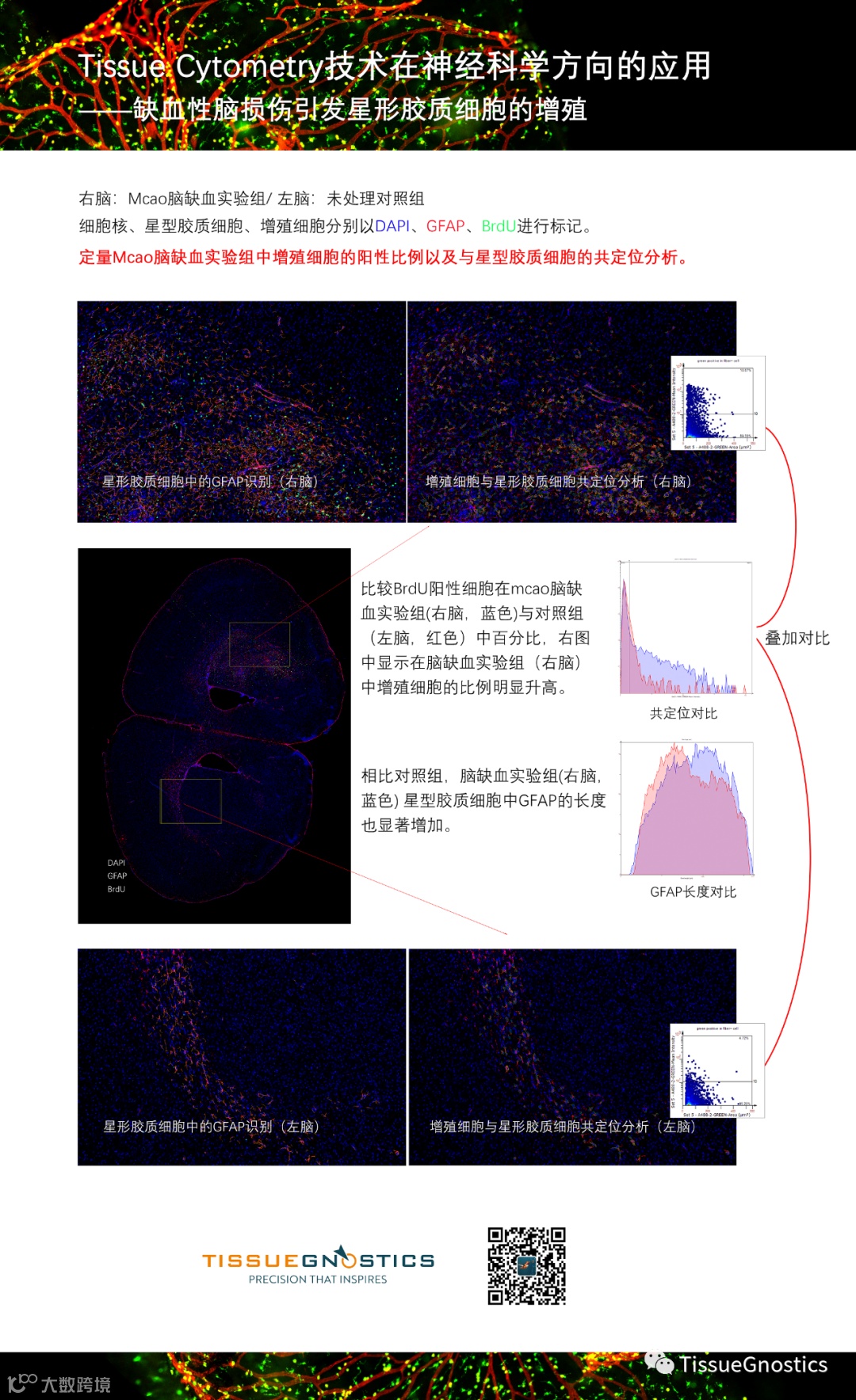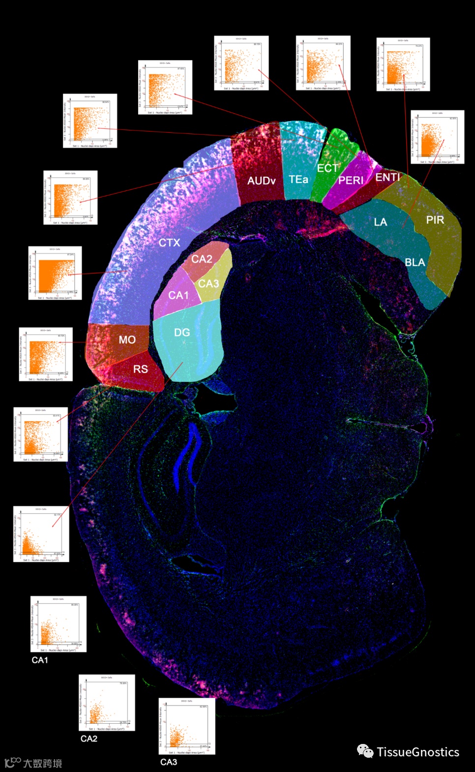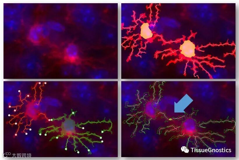 Tissue Cytometry 定量分析技术可以在光学分辨率水平,识别不同神经细胞发起的不同神经纤维中,互相交联纤维的数量关系。结合 Tissue Cytometry 在全景尺度下的细胞核/质/突触的大数据空间分布分析等功能,提供在神经细胞爬片、脑组织切片中,神经细胞发育情况,神经疾病发展转归,信号通路传递影响等方面的更多更精准的研究数据。