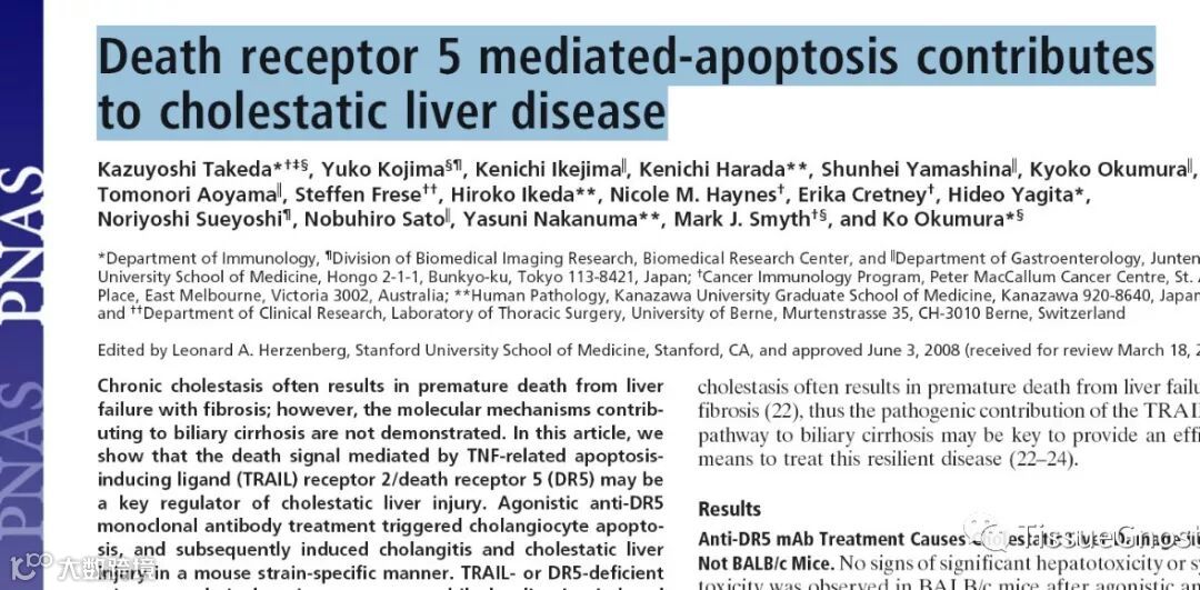 Death Receptor 5介导的细胞凋亡导致胆汁淤积性肝病 《PNAS》