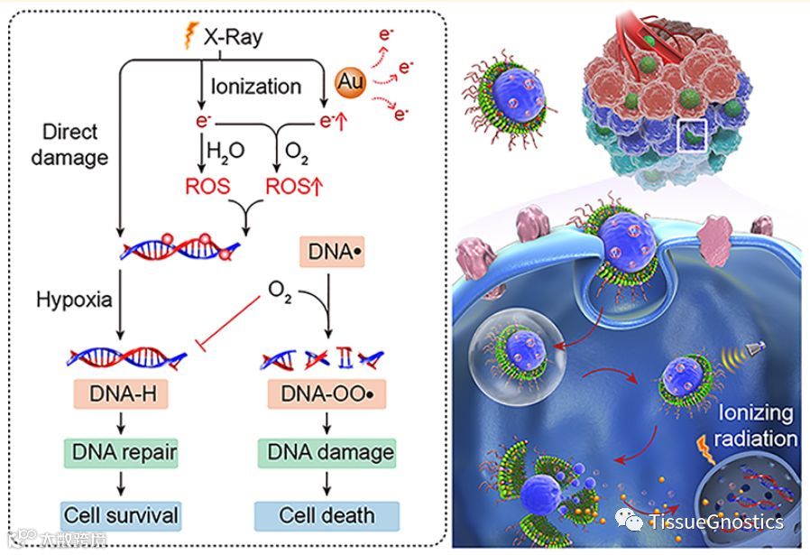 该文章主要阐明了肿瘤放射治疗的成功往往受到两种因素的共同影响,即DNA损伤不足和治疗后DNA修复速度快。现有的优化放射治疗效果的策略往往只关注问题的一个方面,这在长期试验中可能无法发挥作用。此文章利用一种新型分层复用纳米液滴的DNA双重靶向方法来增强肿瘤放射治疗,这种方法可以同时促进DNA损伤的形成并防止随后的DNA损伤修复包裹在液体纳米液滴中的纳米金纳米粒子可以集中辐射能量,并通过增强γ-H2AX病灶的形成和体内肿瘤生长抑制而引起明显的DNA损伤。