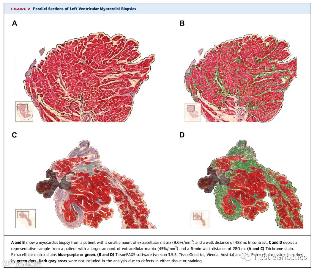 保留射血分数心力衰竭的患者运动耐受能力降低,运动劳累和呼吸空难等症状,研究者通过研究该类型患者的6分钟行走距离与疾病间相互关系,得出结论6-MWD可作为该疾病临床实验的有效判断终端。其中在组织学水平进行相关性判断时利用TissueFAXS系统量化不同6MWD病人活检样本胞外基质比例差异。该研究成果发表在《JACC: heart failure》上。