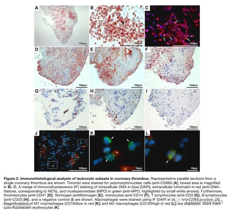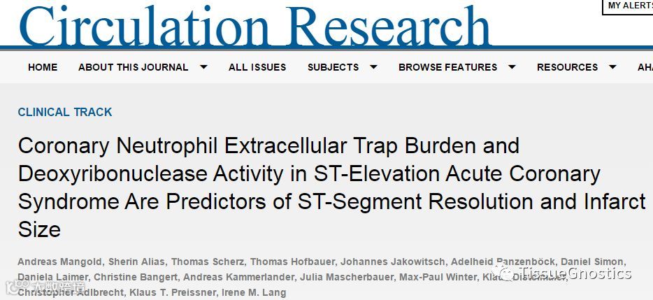 研究者利用TisssueFAXS系统发现中性粒细胞在ST段抬高型急性冠状动脉综合征患者病灶区域血栓内存在聚集现象,相较于其他类型白细胞数量升高明显。而且血栓内中性粒细胞陷阱(NETs)生成明显,结合其他实验和临床数据发现NETs生成是ST段回落和心肌梗死面积的predictor.该研究结果发表在《Circulation Research》上。