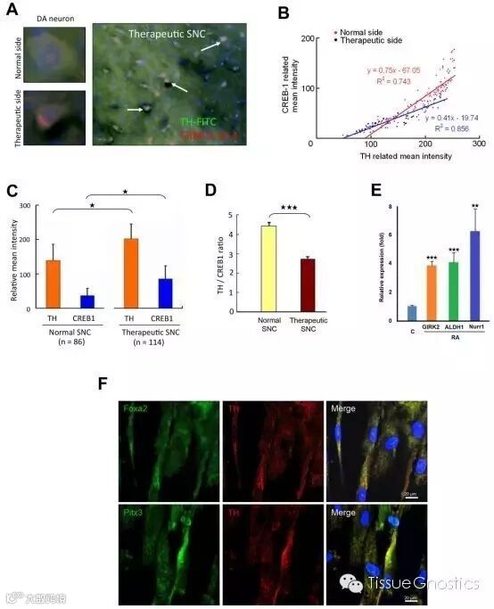 利用奥地利TG公司的TissueFAXS进行了高质量的图像获取,进而利用Tissuequest分析体内TH和CREB1的表达。 (A)的左侧图片:阳性CREB1(红色)和TH(绿色),在正常的SNC(上图)和治疗SNC(下图)多巴胺神经元中的表达。右面板:TH共定位和CREB1在治疗SNC的再生DA能神经元(箭头)在PD大鼠脑HTS细胞源性神经干细胞的12周植入后。 (B)在正常SNC和经过12周植入治疗SNC的DA神经元中计算CREB1和TH表达强度的对应分布关系。R2 = 0.856。TH的相对表达和正常的多巴胺神经元之间CREB1的(CD)的比较(左,每组86细胞计数)和再生的多巴胺神经元(右中,n =计数114个细胞)在脑切片在植入后(C)和意思是TH的力度,在DA能神经元CREB1比例在治疗SNC比正常SNC(D)显著降低。(E)RA通过增加qPCR分析一天的培养后GIRK2,ALDH1和Nurr1的mRNA的水平。(F)免疫荧光成像揭示TH与Foxa2的和Pitx3共同表达。 N = 4,数据表示平均±SD,★:P <0.05,★★:P <0.01,★★★:P <0.001。