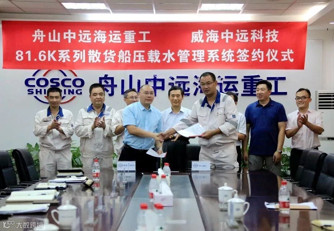 8月22日,舟山中远海运重工与威海中远科技“8.16万吨系列散货船压载水系统供货合同”签约仪式在舟山六横举行。