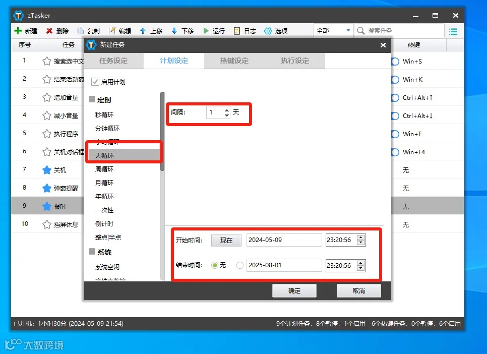 完成基本任务设置之后,下一步是安排任务的执行频率,也就是计划的配置,由于网站签到需每日进行,因此冬蝉将周期设定为每天一次,间隔时间设置为24小时,确保结束时间在开始时间之后。