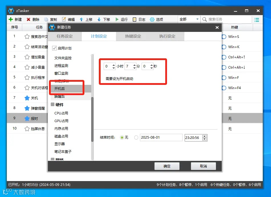如果你觉得快捷键容易遗忘的话,可以返回上一步,在系统中将任务的执行时间设置为开机之后的几分钟内