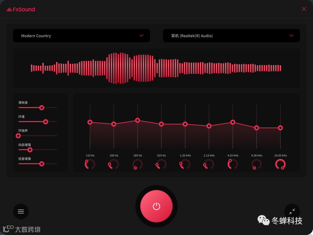 你可以在左边调整各项参数的大小,如清晰度、环境声、环绕声、以及重低音,适合小白用户。右边是均衡器,适合专业的调音人员。