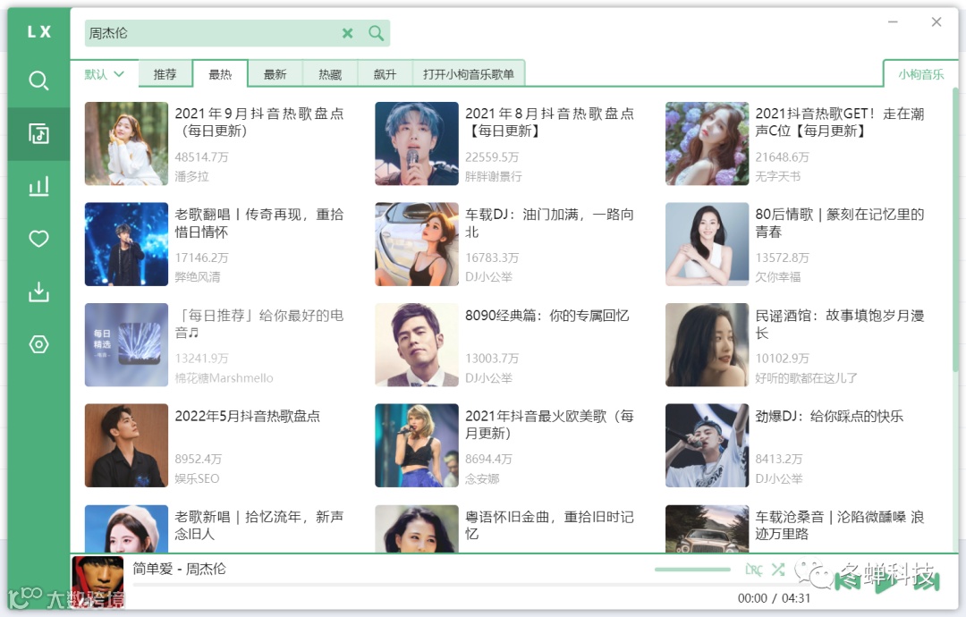 如有需要速领,资源失效请添加微信“dongchanguanfang”。今天给大家带来的软件资源是--洛雪音乐,洛雪音乐为广大用户带来了海量高品质的音乐。该软件包含了所有的音乐网站,聚合了各大音乐平台搜索,可以免费试听且下载全网付费歌曲和无损音乐(电脑桌面版支持下载,安卓手机版本暂不支持)。除此之外,还有韩国的 genie榜、 YouTube音频榜、日本歌曲榜、英国 UK榜等等,不管是什么风格的歌曲,各种榜单,歌单收藏,轻松满足你的音乐需求。如果受够了其他软件绑架可以来试试这款音乐软件~小编向各位推荐,本软件保证能让您满意!