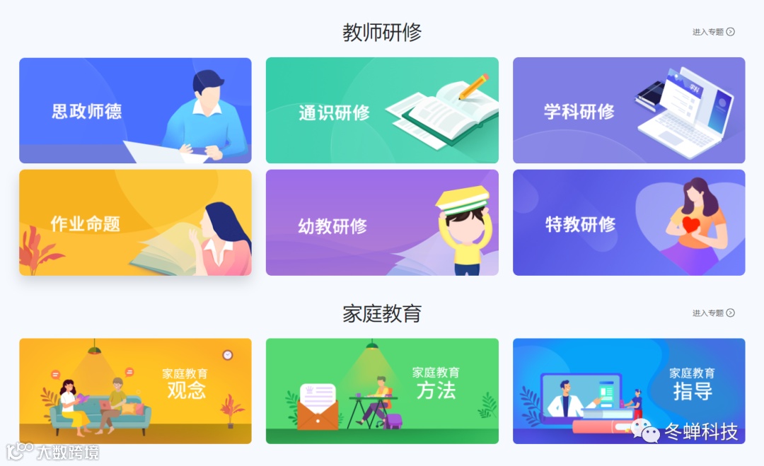 也有属于老师的模块--教师研修,可以获取到比如指向核心素养的单元作业设计与实施、作文命题、幼教研修等知识,同时咱们家长也有响应的家庭教育模块。