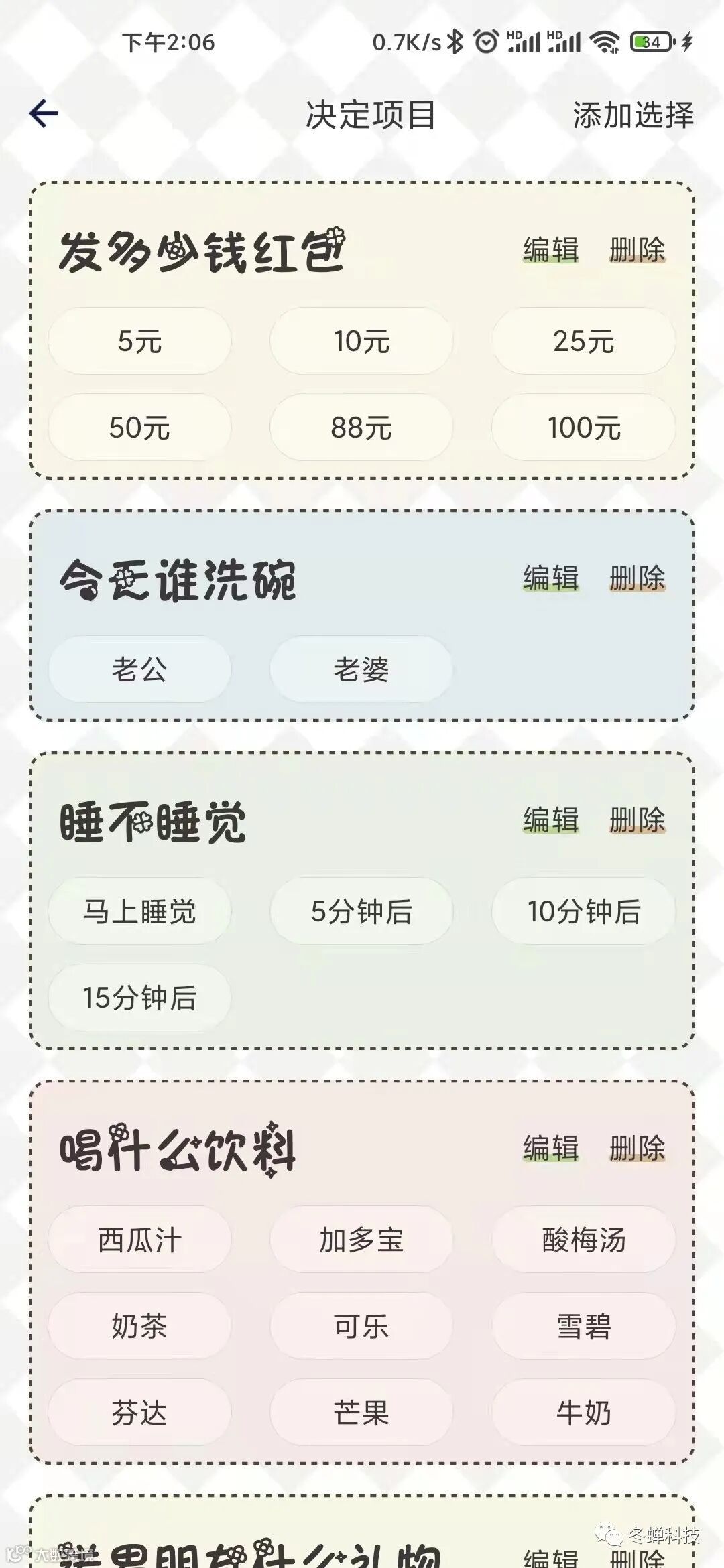 今天给大家推荐一款幸运转盘的软件,名为“小决定幸运选择器”,当出现过以下情况的小伙伴自行领取,晚上熬夜睡不睡觉?天气太热,喝什么饮料?发红包发多少?聚餐吃火锅点的剩菜谁吃等等等.....小编为大家找到了一个可编辑转盘小工具软件,无广告! 自定义选项!免费!清新简约!废话不多说直接上图~