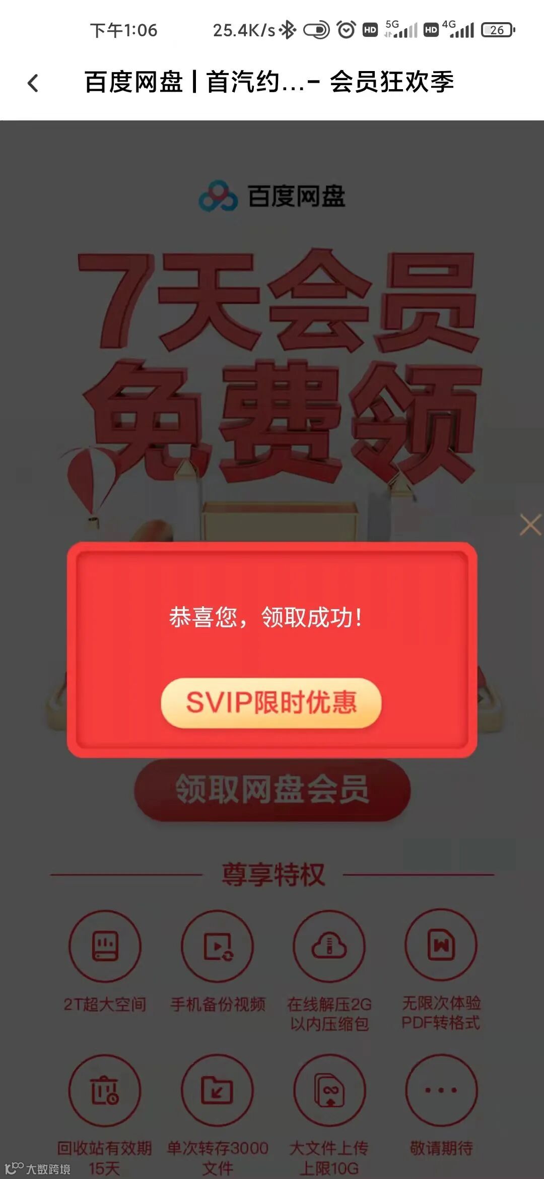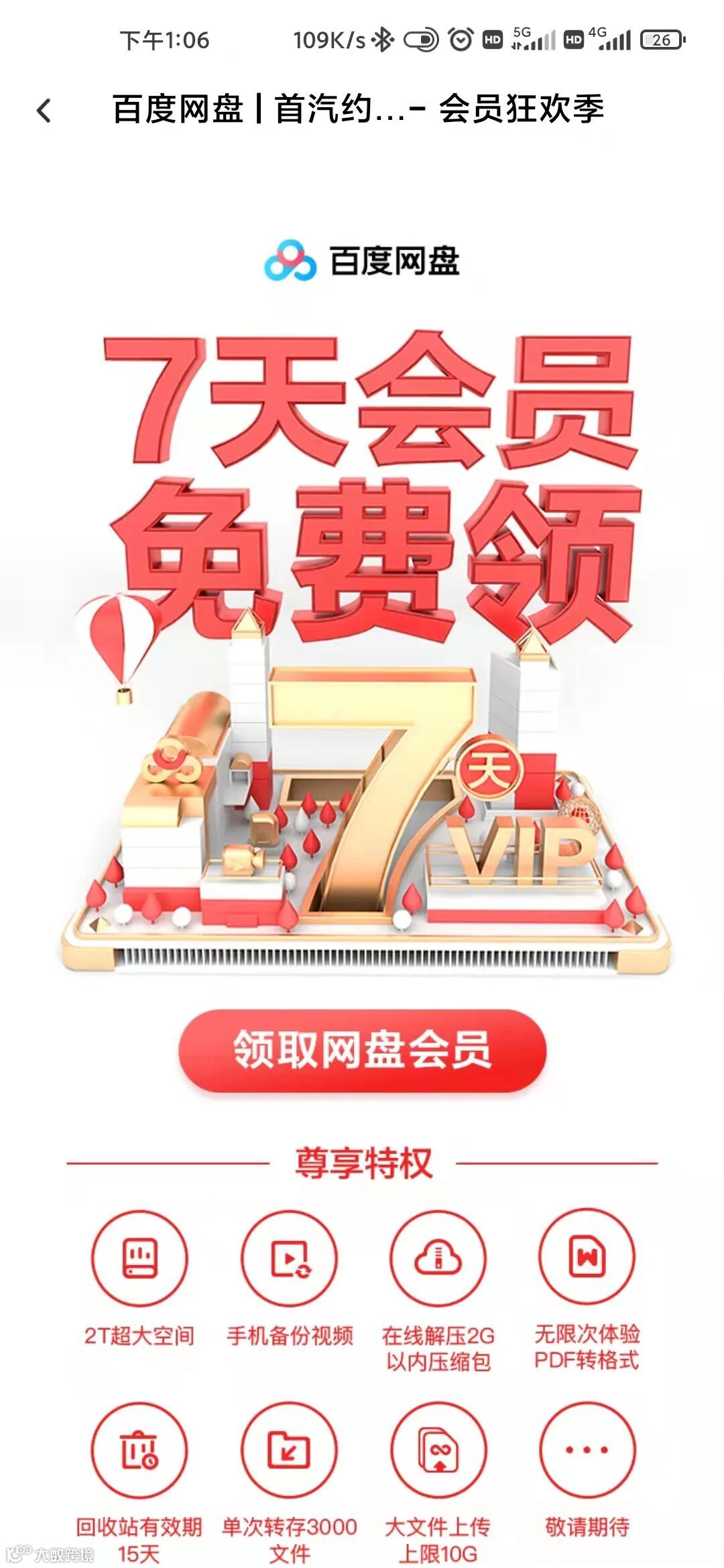 点击会显示一个二维码,用百度网盘APP扫描二维码即可领取会员。