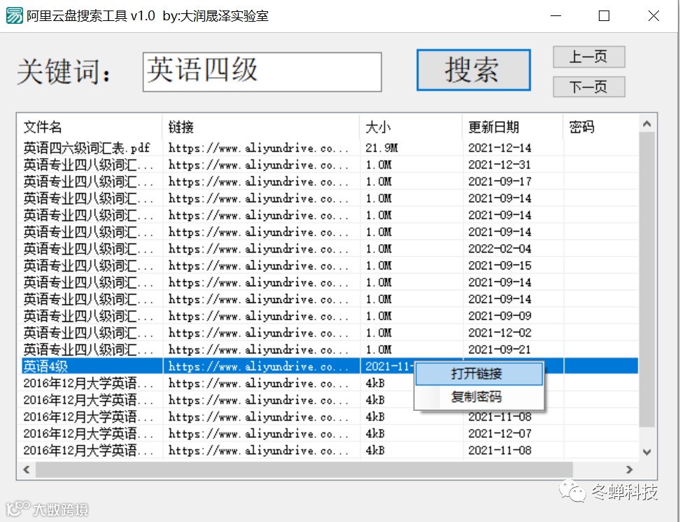 今天给大家带来一款阿里云盘资源搜索神器,让你从此秒变资源大佬!本软件是易语言程序,如有病毒提升,请关掉防病毒。使用起来非常的简单,只需要输入你的关键字来进行搜索。选择链接右键打开链接即可。