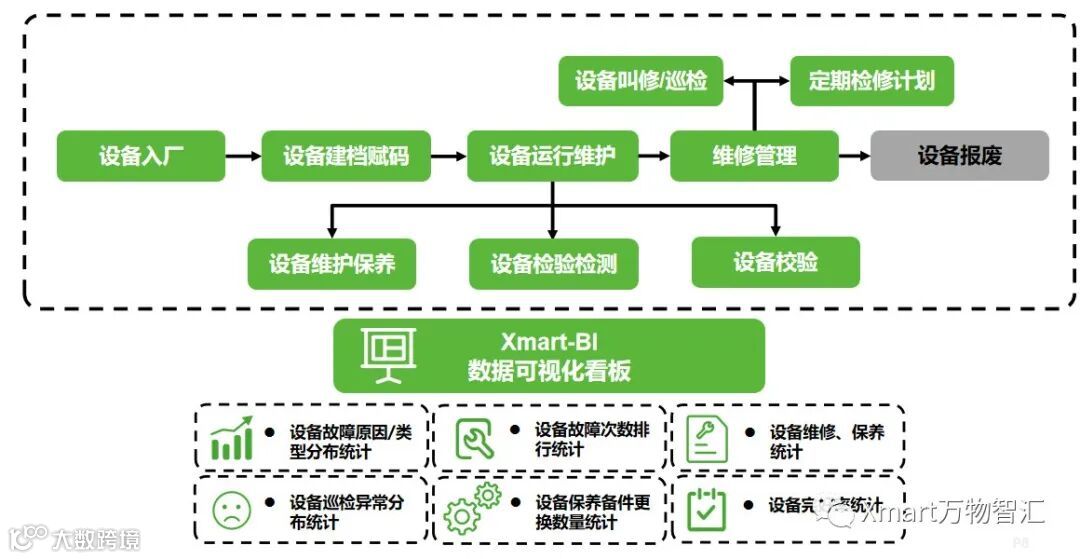 叫修人员可通过扫描设备码,将需要维修的内容通过拍照或者视频的方式上传至系统,完成对维修工单的下派。维修人员接受到维修工单之后,同样通过扫码设备条码,完成对维修设备问题的记录,后期可对设备的故障问题在系统内进行查询。最后基于维修过程的记录,系统可通过BI看板可视化的展现,如:设备故障原因分布统计、设备故障次数排行、设备零备件更换数量等。其中,采购部门可根据零备件可视化看板或系统对零备件预警的提醒,提前对零备件进行采购,保证在维修保养过程中备品备件仓库存的充足。