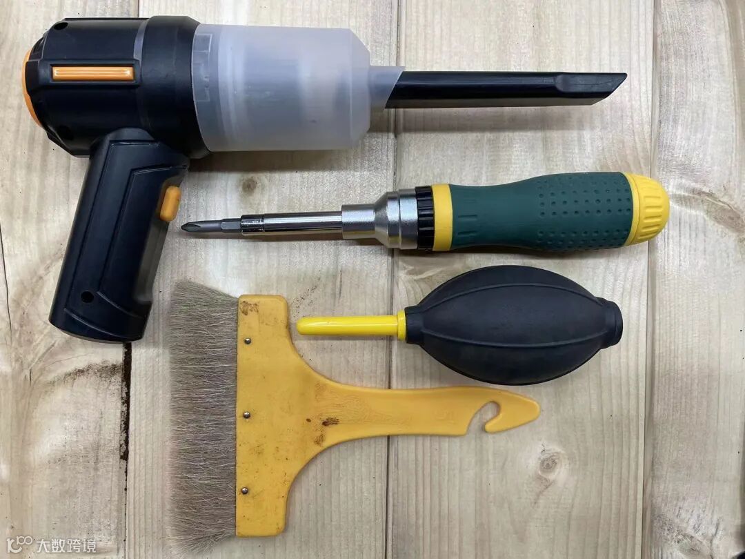 我们将用到:螺丝刀、手持式吸尘器、刷子、皮吹及螺丝收纳(此处可用豆仓盖代替)