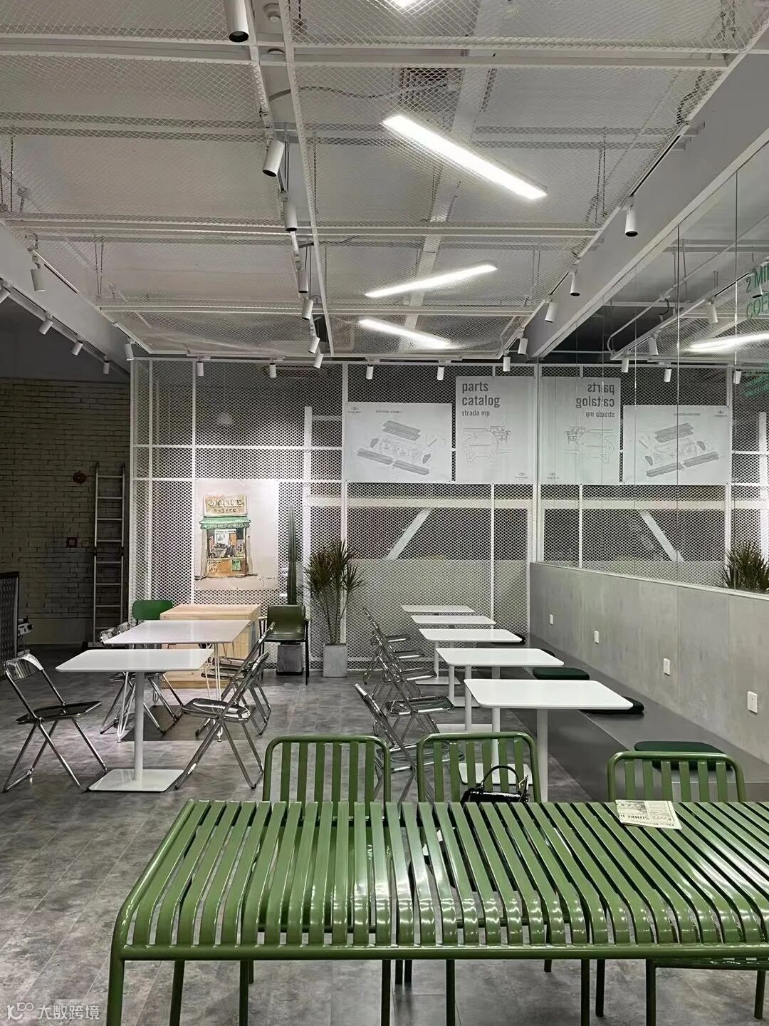 配合着店内灰白绿相间工业风装潢