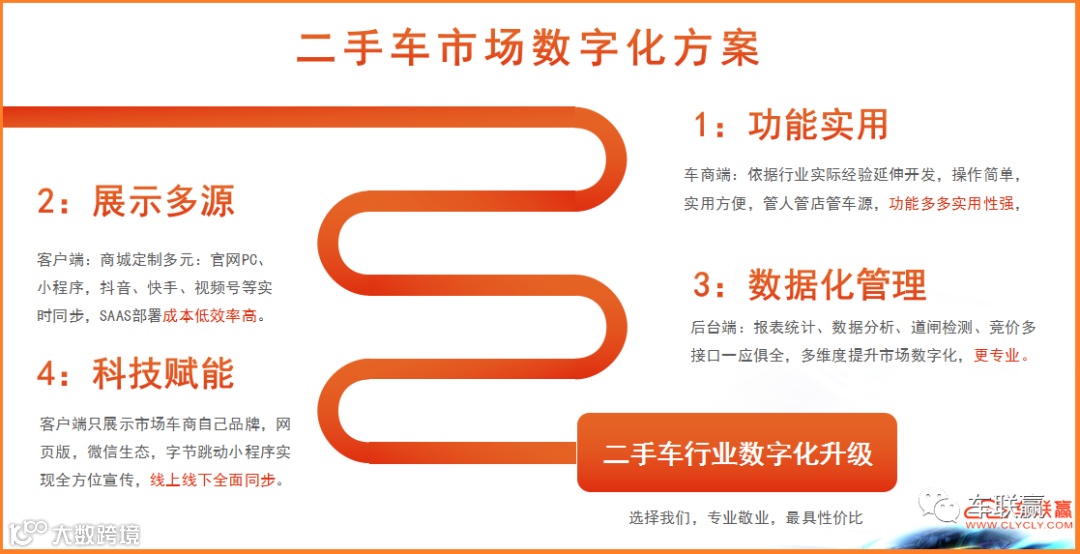车联赢 作为二手车行业的专业系统服务商,深耕二手车行业多年,依托服务车商为基础的底层逻辑,及十余年的二手车市场管理运营经验,十余年的4S店经销商集团二手车合作经验,专注二手车行业的数字化升级系统服务,助力有想法的合作单位,全方位打造自身品牌客户端及专业系统服务!