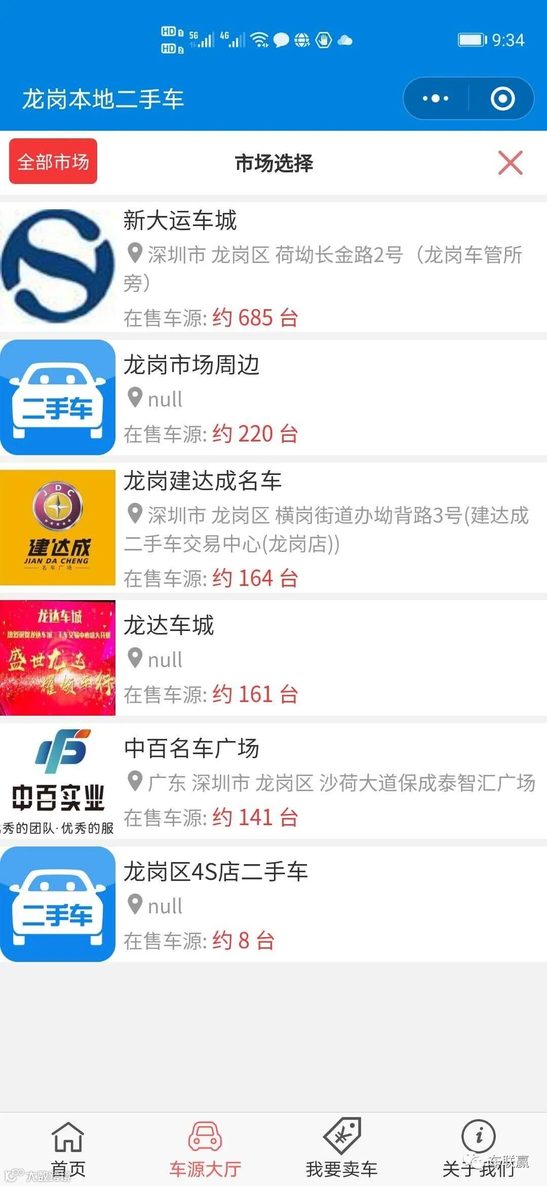 小程序案例:龙岗本地二手车,可多个市场合并展示