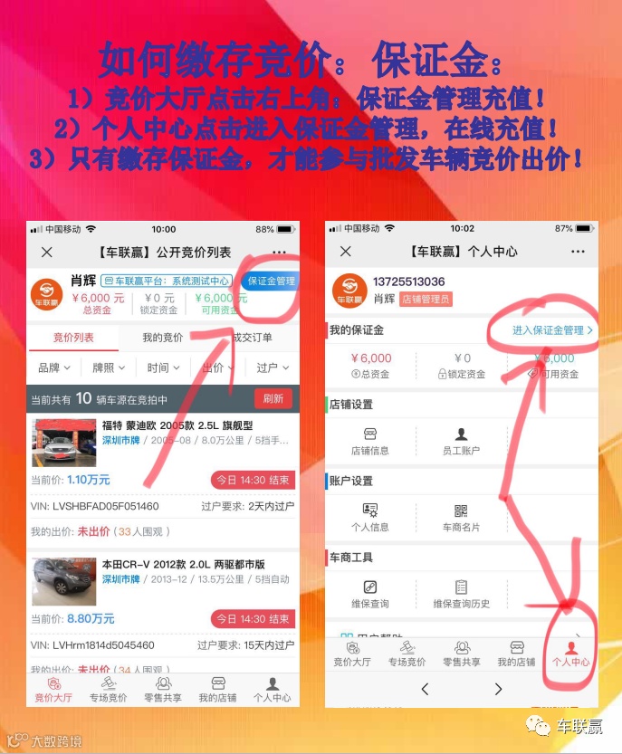 2:登陆竞价大厅,可在线查看所有意向批发车源的展示信息,(未在线缴存保证金,不能参与竞价出价),为保证出价公平性,需在线充值最低2000元保证金后,可即时参与竞价出价了,保证金在未确认订单及成交车辆时,可随时在线全额提取,平台不收任何手续费;
