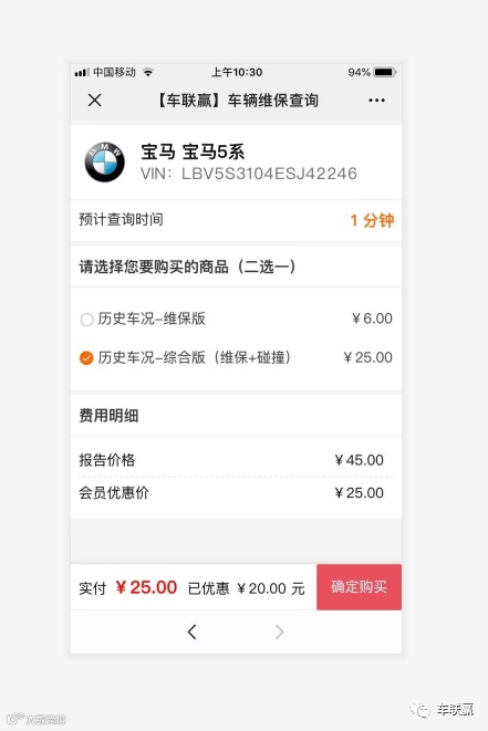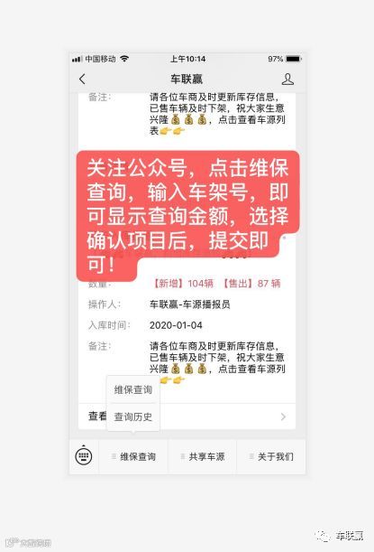 第一步:关注车联赢公众号:点击维保查询