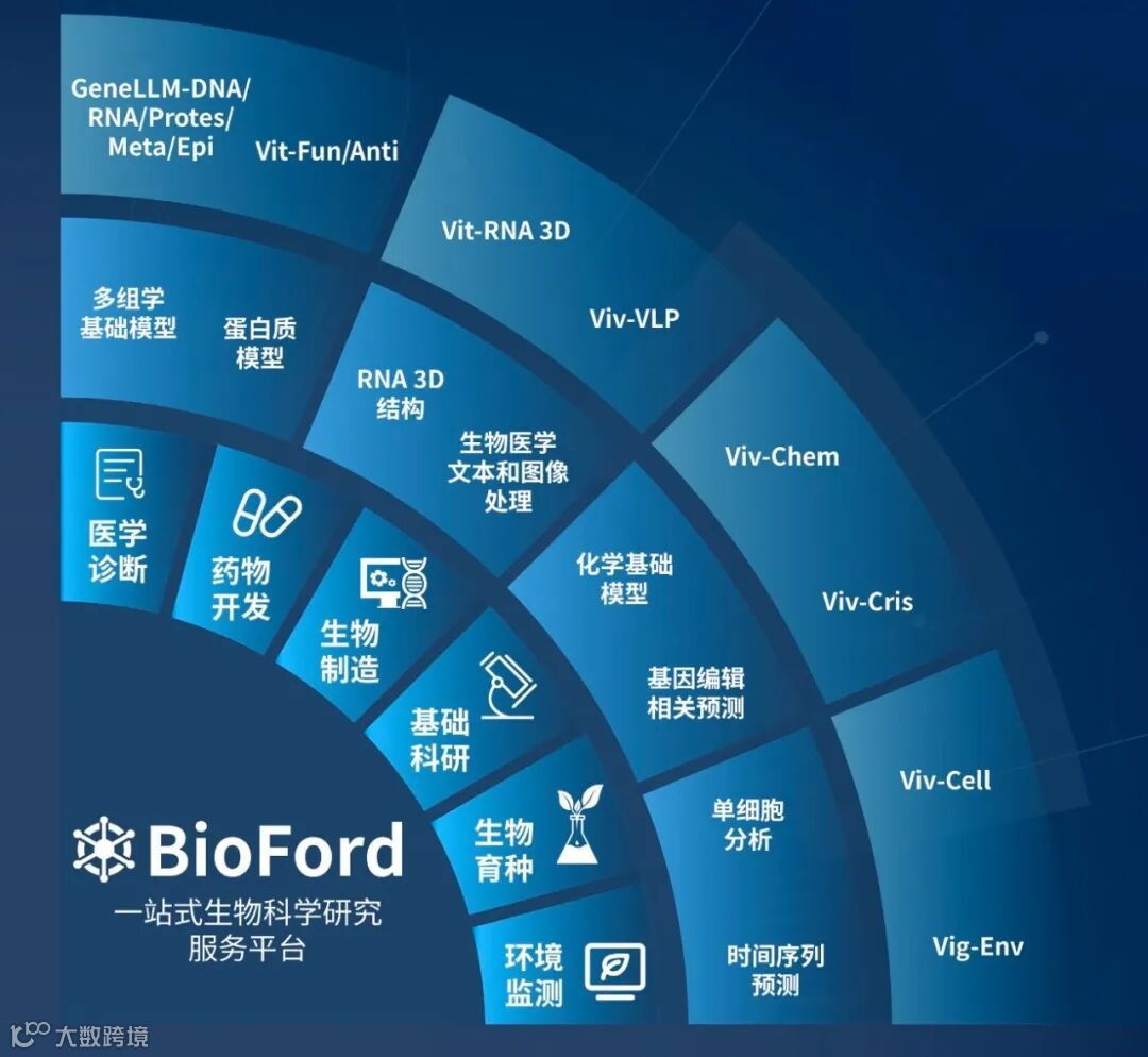 以 GeneLLM™ 为核心构建的一站式生物科学研究平台 Bioford™,现已整合上百个垂直生物科学领域模型,支持基因组、转录组、蛋白质、RNA 三维结构、生物医学图像及文本数据等多模态数据的全面智能分析,以满足生物医学、生物信息学、分子生物学、免疫学以及分子动力学等各学科的研究需求。平台聚焦基础科研、医学诊断、生物制造、环境监测、生物育种及药物开发六大核心场景,提供从实验室数据处理、小样本训练到模型微调及推理服务的完整解决方案。