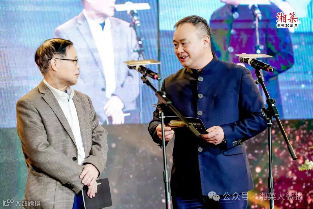 湖南省餐饮行业协会名誉会长周新潮、《湘菜》杂志荣誉总编丁柳生为10位“湘菜文化领军品牌”开奖。