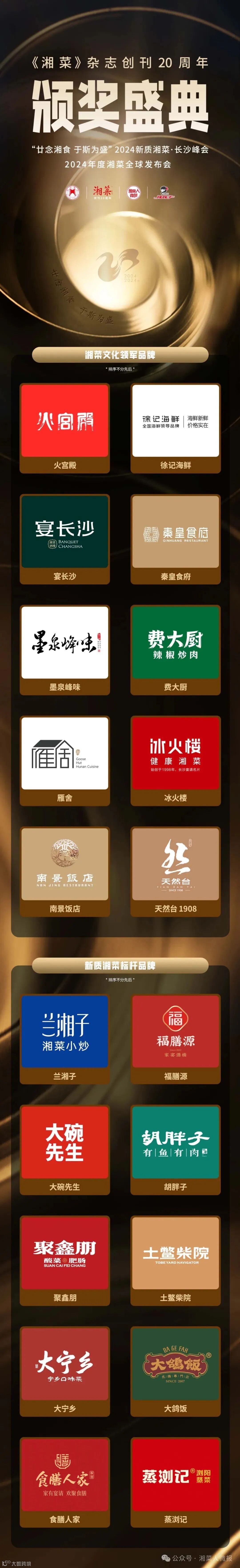 20年,湘菜行业涌现出一大批推动产业发展的个人和品牌,为将这份荣誉广而告之,将这份感动与世界分享。《湘菜》杂志创刊20周年颁奖盛典设立“湘菜文化传播大使”、“湘菜文化领军品牌”、“新质湘菜标杆品牌”、“新质湘菜风云人物”、“新质湘菜金牌服务商”、“湘菜供应链杰出经销商”六大奖项,为行业树立榜样、天下湘菜人共享荣光。