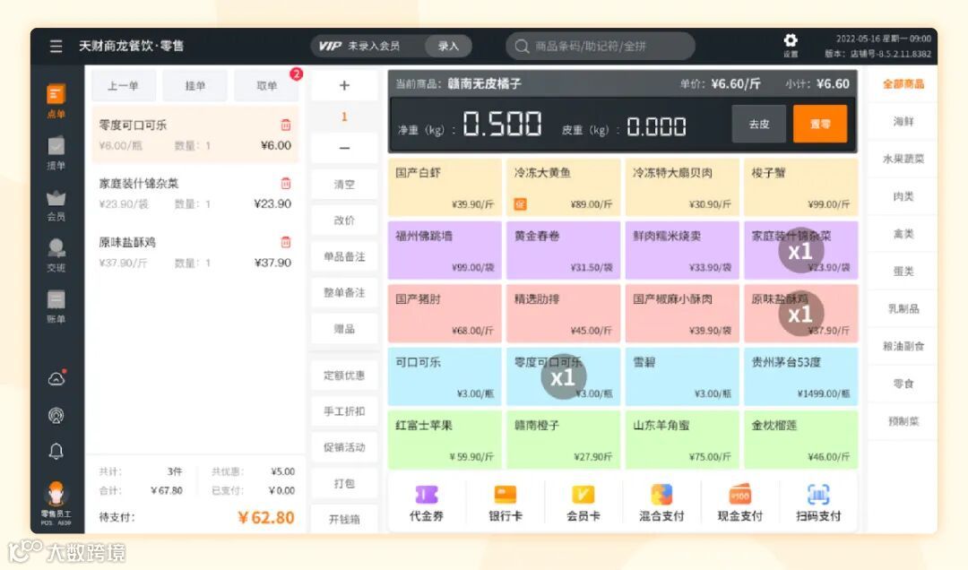天财商龙餐饮·零售系统,配备了适用于生鲜、现切酱货的点单收银、适用于水果蔬菜的称重收银、适用于标准包装产品的扫码收银,以及顾客自助结算的自助点餐机等多种收银模式,全方位满足不同类型的餐饮零售门店的结算需求。