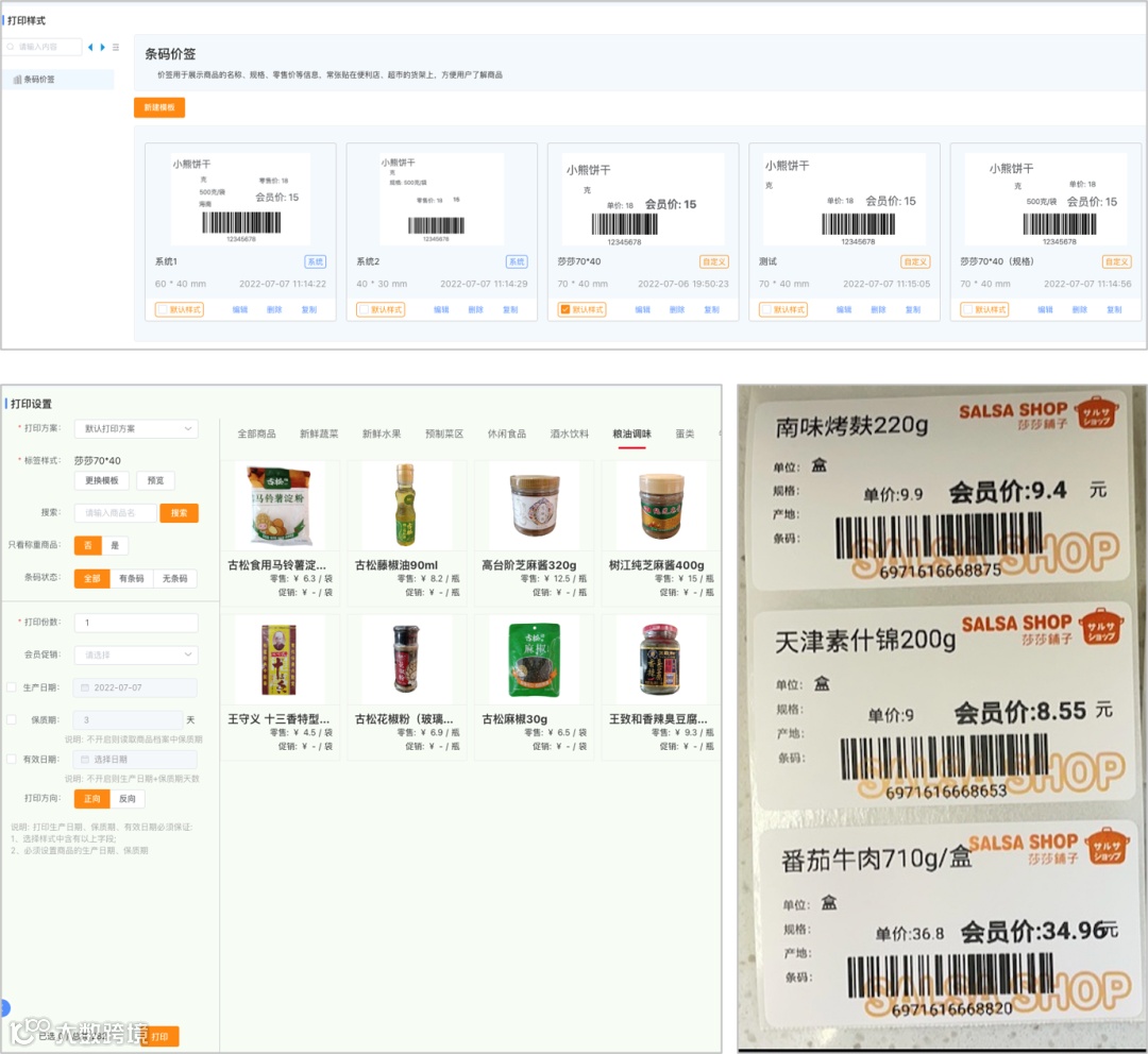 零售店内会有一些预包装产品,为了符合规范及方便管理,需要打印产品的预包装标签,涉及产品生产日志,保质期,销售价,会员价,条码等。
