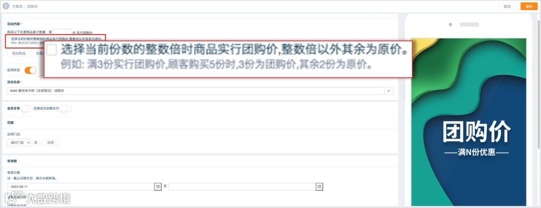为此我们在原有团购活动基础上增加了新的玩法限定数量;满足团购活动份数整数倍数可享受团购价格,其余的保值原有价格。例如: 满3份实行团购价,顾客购买5份时,3份为团购价,其余2份为原价。这就促使购买5份消费者再购买一份就都可以享受团购价格,促使其再次购买。