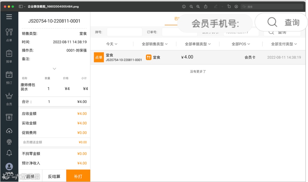 在社区零售门店会员完成结算后想对某个商品进行退单。收银员可在已结算账单界面通过手机号码快速找到该笔账单进行操作。