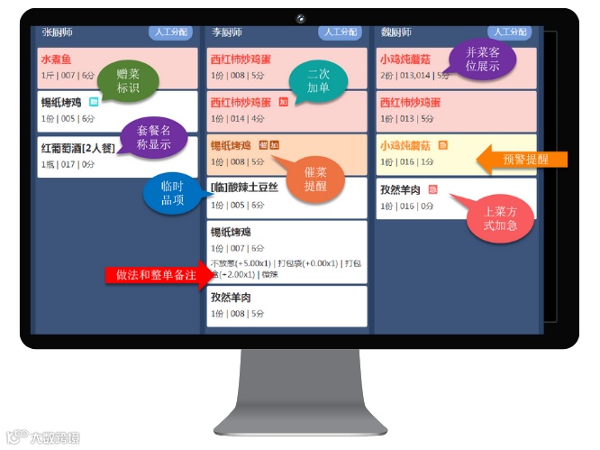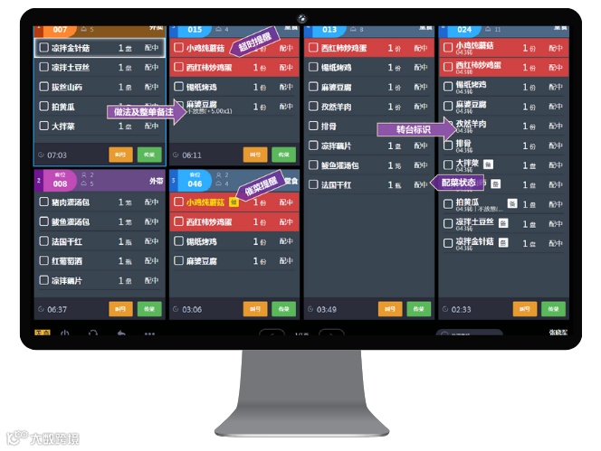 天财商龙厨房智能出品解决方案厨师长控菜看板调控前厅下单、后厨起菜、不同用户不同需求,高峰期也能井然有序,保证出餐效率。