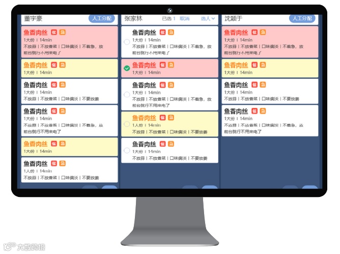 天财商龙厨房智能出品解决方案帮助打荷有序分配菜品,及时响应前厅催、起,高效串联切配与厨师,掌握厨房流水线的速度。