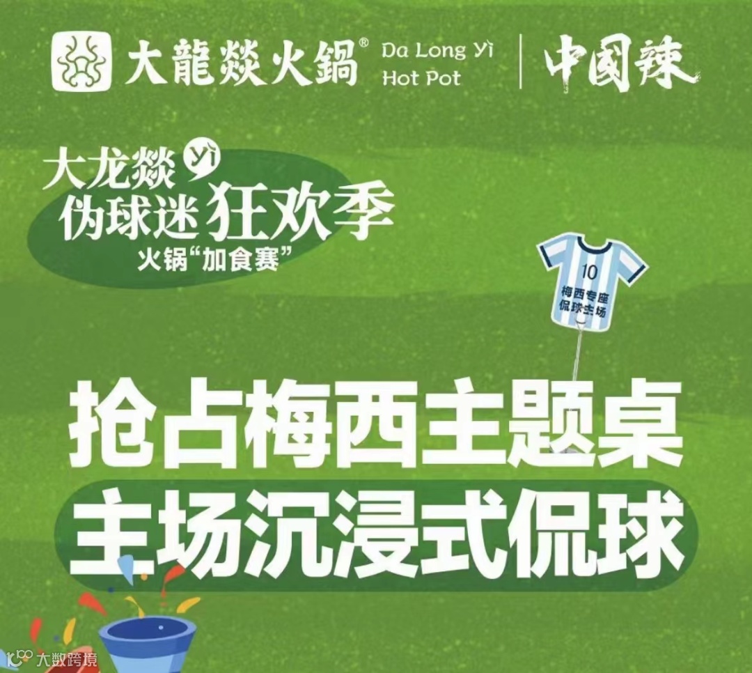 大龙燚火锅将“足球”端上餐桌,推出一款重达240克足球造型的牛油底料,搭配“冠军球队竞猜呱呱卡”,增设“梅西主题桌”,还推出了10000颗“金球”火锅底料免费送活动,非常有世界杯“氛围”。