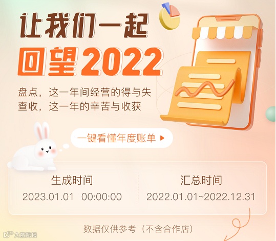 2022年年度账单,汇总数据时间段为2022-01-01~2022-12-31日,账单包含经营概况、餐厅指标、行业数据、成本支出概况、供应链、会员相关以及外卖、智慧餐厅等数据。