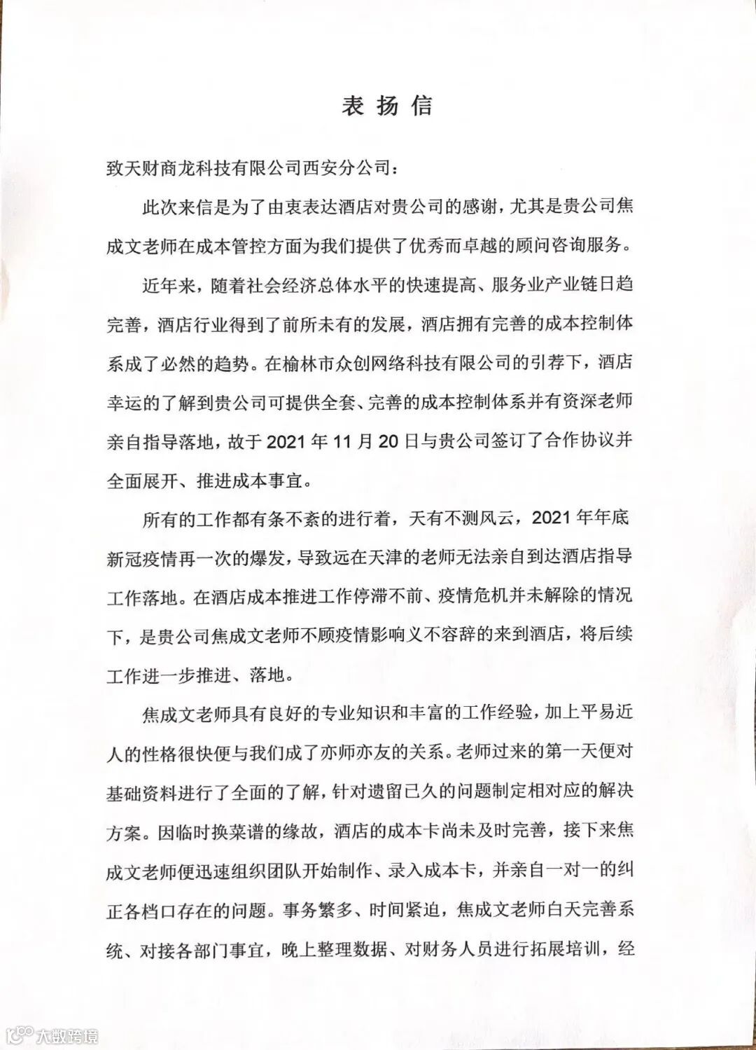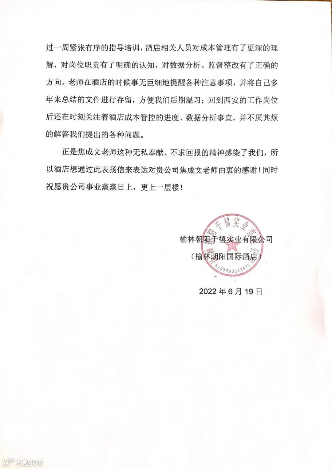 6月20日,天财商龙总部收到了一份来自榆林朝阳千禧实业有限公司(榆林朝阳国际酒店)发来的表扬信。信件中,对商龙西安分公司项目经理焦成文表达了感谢,也为其昼夜不停为酒店成本运营完成落地点赞。