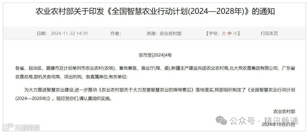 各位关注中国农业现代化进程的朋友们,今天,我们要向大家隆重介绍一份划时代的战略性文件——由国家权威部门于 2024年10月发布的《全国智慧农业行动计划(2024—2028年)》。这份行动计划,犹如一盏指路明灯,清晰地擘画了未来五年中国智慧农业发展的宏伟蓝图,预示着一场深刻的农业变革即将席卷而来!